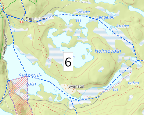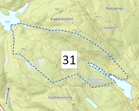 Et skogsterreng med noe åpen skog og myrdrag og vann.